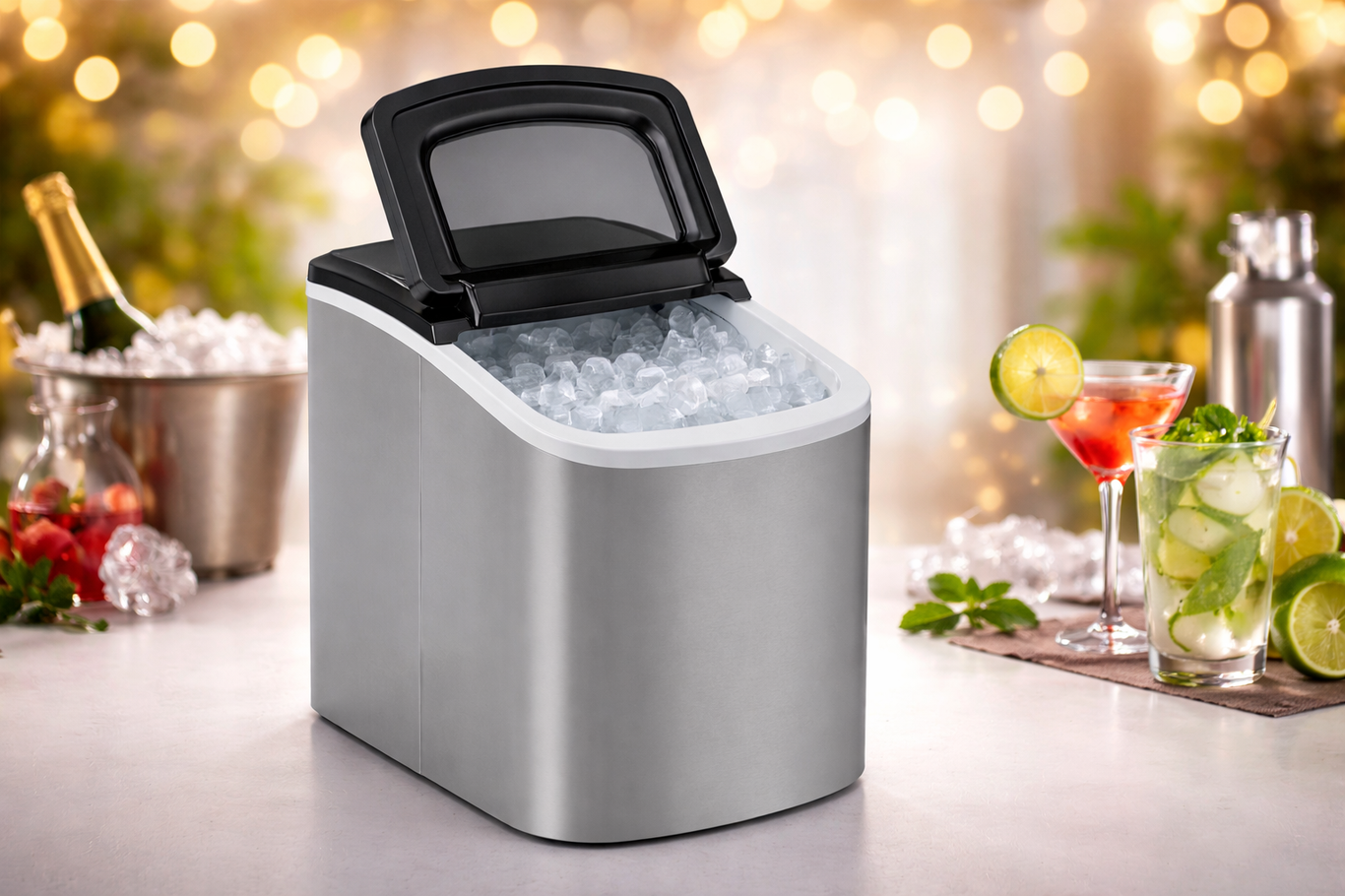 Immer genug Eis für Drinks. Die Maschine produziert schnell frische Eiswürfel und ist ideal für Sektempfang, Cocktailbar oder lange Partynächte.